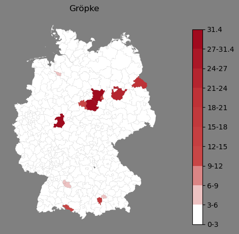 Relative Verteilung des Namens Gröpke (1996)Direkt zur Karte Die Farbskala zeigt die Anzahl von "Gröpke" bezogen auf je 1 Million Einträge. |