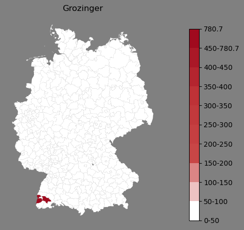 Relative Verteilung des Namens Grozinger (1996)Direkt zur Karte Die Farbskala zeigt die Anzahl von "Grozinger" bezogen auf je 1 Million Einträge. |