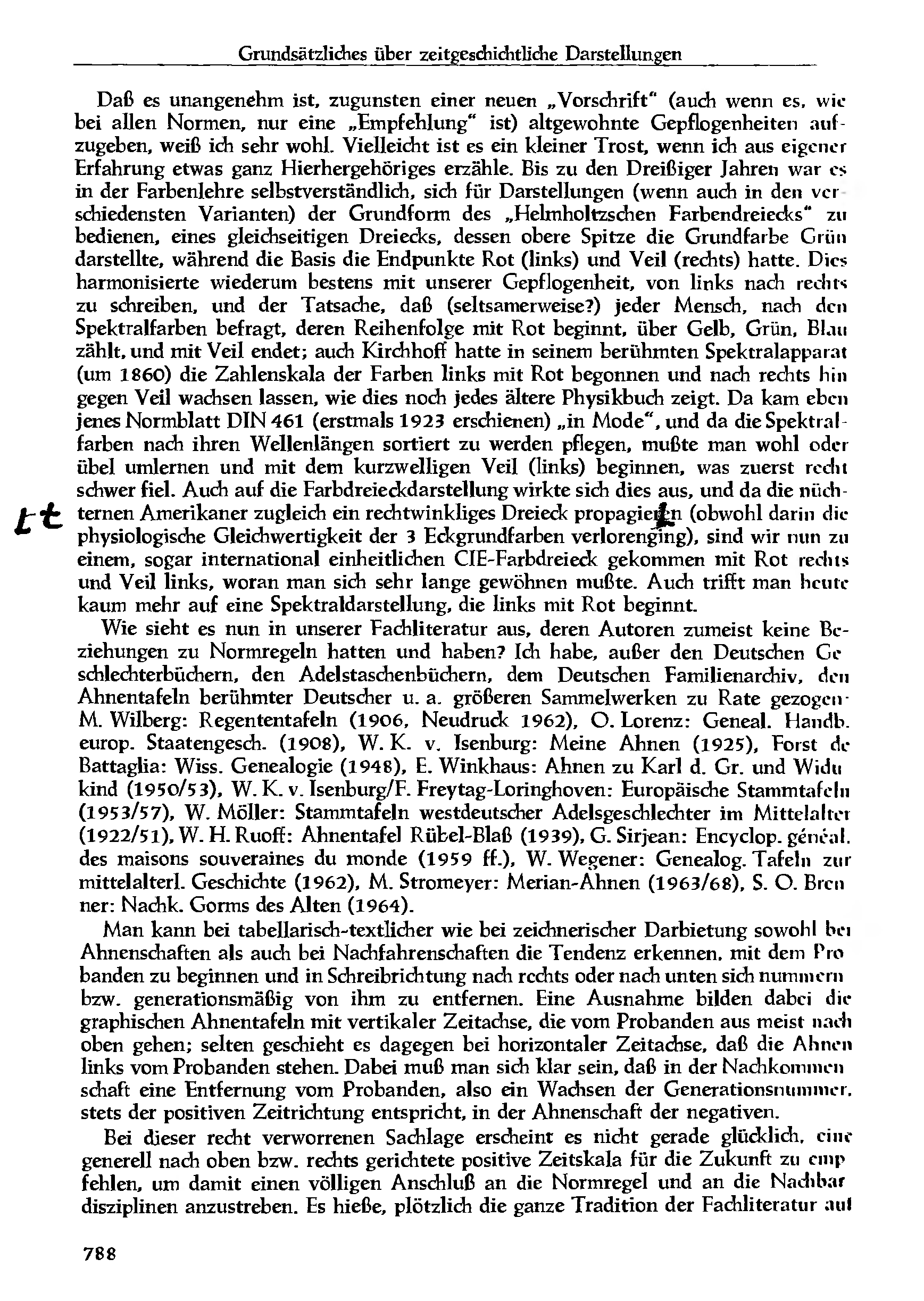 Wie sieht es nun in unserer Fachliteratur aus, deren Autoren zumeist keine Beziehungen zu Normregeln hatten und haben? Ich habe, außer den Deutschen Geschlechterbüchern, den Adelstaschenbüchern, dem Deutschen Familienarchiv, den Ahnentafeln berühmter Deutscher u. a. größeren Sammelwerken zu Rate gezogen: M. Wilberg: Regententafeln (1906, Neudruck 1962), O. Lorenz: Geneal. Handb. europ. Staatengesch. (1908), W. K. v. Isenburg: Meine Ahnen (1925), Forst de Battaglia: Wiss. Genealogie (1948), E. Winkhaus: Ahnen zu Karl d. Gr. und Widukind (1950/53), W. K. v. Isenburg/F. Freytag-Loringhoven: Europäische Stammtafeln (1953/57), W. Möller: Stammtafeln westdeutscher Adelsgeschlechter im Mittelalter (1922/51), W. H. Ruoff: Ahnentafel Rübel-Blaß (1939), G. Sirjean: Encyclop. généal. des maisons souveraines du monde (1959 ff.), W. Wegener: Genealog. Tafeln zur mittelalterl. Geschichte (1962), M. Stromeyer: Merian-Ahnen (1963/68), S. O. Brenner: Nachk. Gorms des Alten (1964).