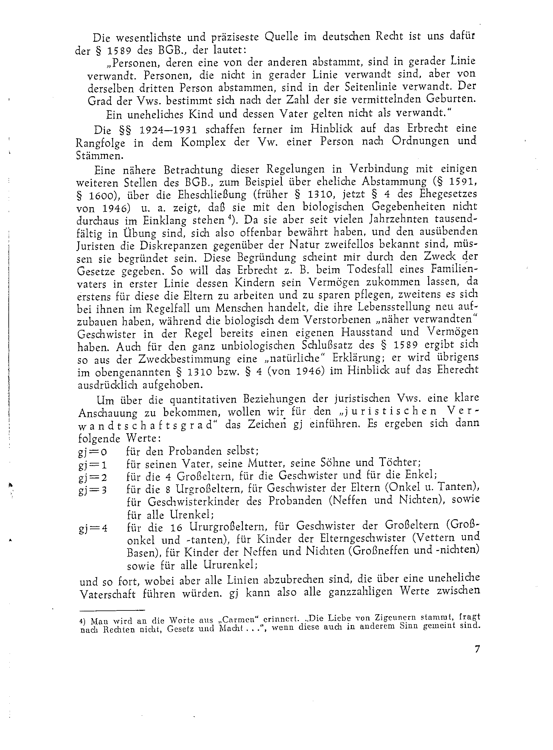 Eine nähere Betrachtung dieser Regelungen in Verbindung mit einigen weiteren Stellen des BGB., zum Beispiel über eheliche Abstammung (§ 1591, § 1600), über die Eheschließung (früher § 1310, jetzt § 4 des Ehegesetzes von 1946) u. a. zeigt, daß sie mit den biologischen Gegebenheiten nicht durchaus im Einklang stehen[1]. Da sie aber seit vielen Jahrhunderten tausendfältig in Übung sind, sich also offenbar bewährt haben, und den ausübenden Juristen die Diskrepanzen gegenüber der Natur zweifellos bekannt sind, müssen sie begründet sein. Diese Begründung scheint mir durch den Zweck der Gesetze gegeben. So will das Erbrecht z. B. beim Todesfall eines Familienvaters in erster Linie dessen Kindern das Vermögen zukommen lassen, da ersten für diese die Eltern zu arbeiten und zu sparen pflegen, zweitens es sich bei ihnen im Regelfall um Menschen handelt, die ihre Lebensstellung neu aufzubauen haben, während die biologisch dem Verstorbenen „näher verwandten“ Geschwister in der Regel bereits einen eigenen Hausstand und Vermögen haben. Auch für den ganz unbiologischen Schlußsatz des § 1589 ergibt sich so aus der Zweckbestimmung eine „natürliche“ Erklärung; er wird übrigens im oben genannten § 1310 bzw. § 4 (von 1946) im Hinblick auf das Eherecht ausdrücklich aufgehoben.
