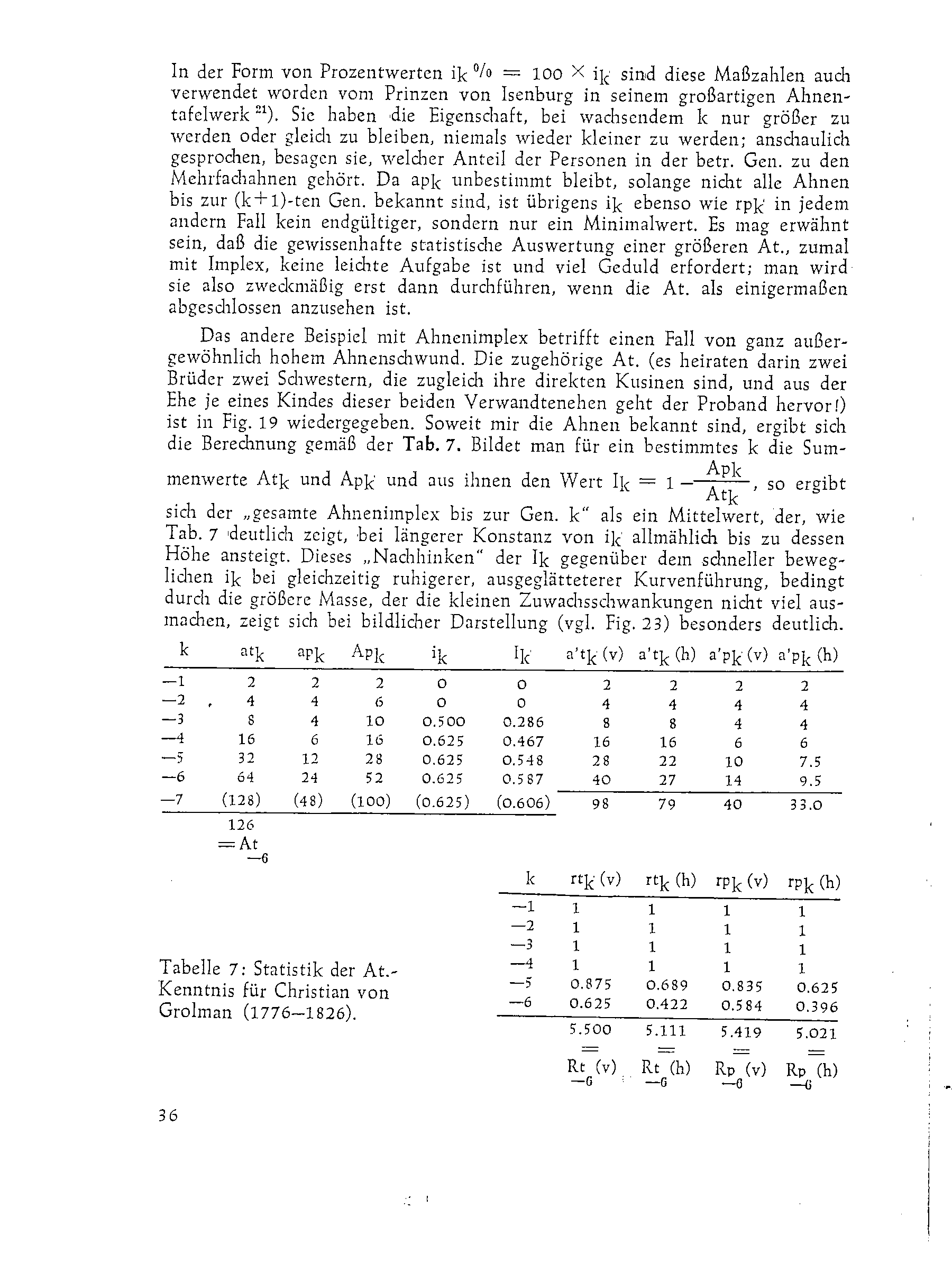 In der Form von Prozentwerten ik% = 100 ✕ ik sind diese Maßzahlen auch verwendet worden vom Prinzen von Isenburg in seinem großartigen Ahnentafelwerk. Sie haben die Eigenschaft, bei wachsendem k nur größer zu werden oder gleich zu bleiben, niemals kleiner zu werden, anschaulich gesprochen, besagen sie, welcher Anteil der Personen in der betr. Gen. zu den Mehrfachahnen gehört. Da apk unbestimmt bleibt, solange nicht alle Ahnen bis zur (k+1)-ten Gen. bekannt sind, ist übrigens ik ebenso wie rpk in jedem andern Fall kein endgültiger, sondern nur ein Minimalwert. Es mag erwähnt sein, daß die gewissenhafte statistische Auswertung einer größeren At., zumal mit Implex, keine leichte Aufgabe ist und viel Geduld erfordert; man wird sie also zweckmäßig erst dann durchführen, wenn die At. als einigermaßen abgeschlossen anzusehen ist.