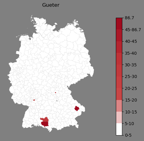 Relative Verteilung des Namens Gueter (1996)Direkt zur Karte Die Farbskala zeigt die Anzahl von "Gueter" bezogen auf je 1 Million Einträge. |