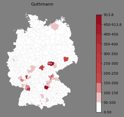 Relative Verteilung des Namens Guthmann (1996)Direkt zur Karte Die Farbskala zeigt die Anzahl von "Guthmann" bezogen auf je 1 Million Einträge. |