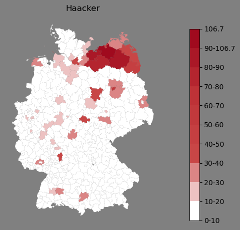 Relative Verteilung des Namens Haacker (1996)Direkt zur Karte Die Farbskala zeigt die Anzahl von "Haacker" bezogen auf je 1 Million Einträge. |