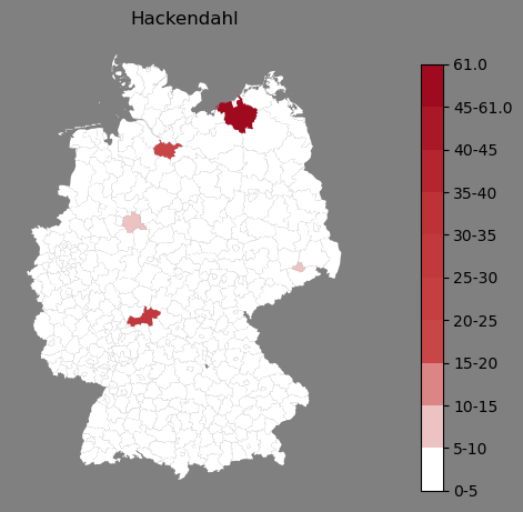 Relative Verteilung des Namens Hackendahl (1996)Direkt zur Karte Die Farbskala zeigt die Anzahl von "Hackendahl" bezogen auf je 1 Million Einträge. |