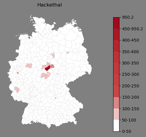 Relative Verteilung des Namens Hackethal (1996)Direkt zur Karte Die Farbskala zeigt die Anzahl von "Hackethal" bezogen auf je 1 Million Einträge. |