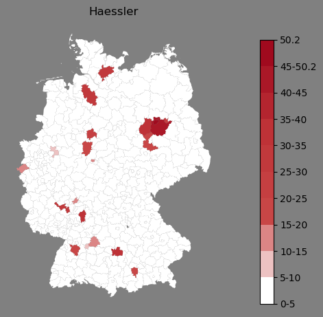 Relative Verteilung des Namens Haessler (1996)Direkt zur Karte Die Farbskala zeigt die Anzahl von "Haessler" bezogen auf je 1 Million Einträge. |