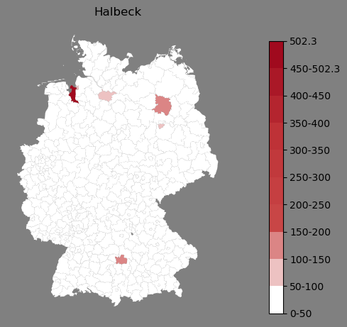 Absolute Verteilung des Namens Halbeck (1890)Direkt zur Karte Absolute Verteilung des Namens "Halbeck" um 1890 im damaligen Deutschen Reich Sie können die Karte innerhalb des Fensters zoomen und verschieben. |