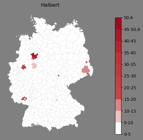 Relative Verteilung des Namens Halbert (1996)Direkt zur Karte Die Farbskala zeigt die Anzahl von "Halbert" bezogen auf je 1 Million Einträge. |