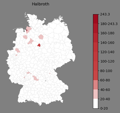 Relative Verteilung des Namens Halbroth (1996)Direkt zur Karte Die Farbskala zeigt die Anzahl von "Halbroth" bezogen auf je 1 Million Einträge. |