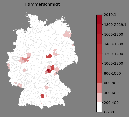 Absolute Verteilung des Namens Hammerschmidt (1890)Direkt zur Karte Absolute Verteilung des Namens "Hammerschmidt" um 1890 im damaligen Deutschen Reich Sie können die Karte innerhalb des Fensters zoomen und verschieben. |