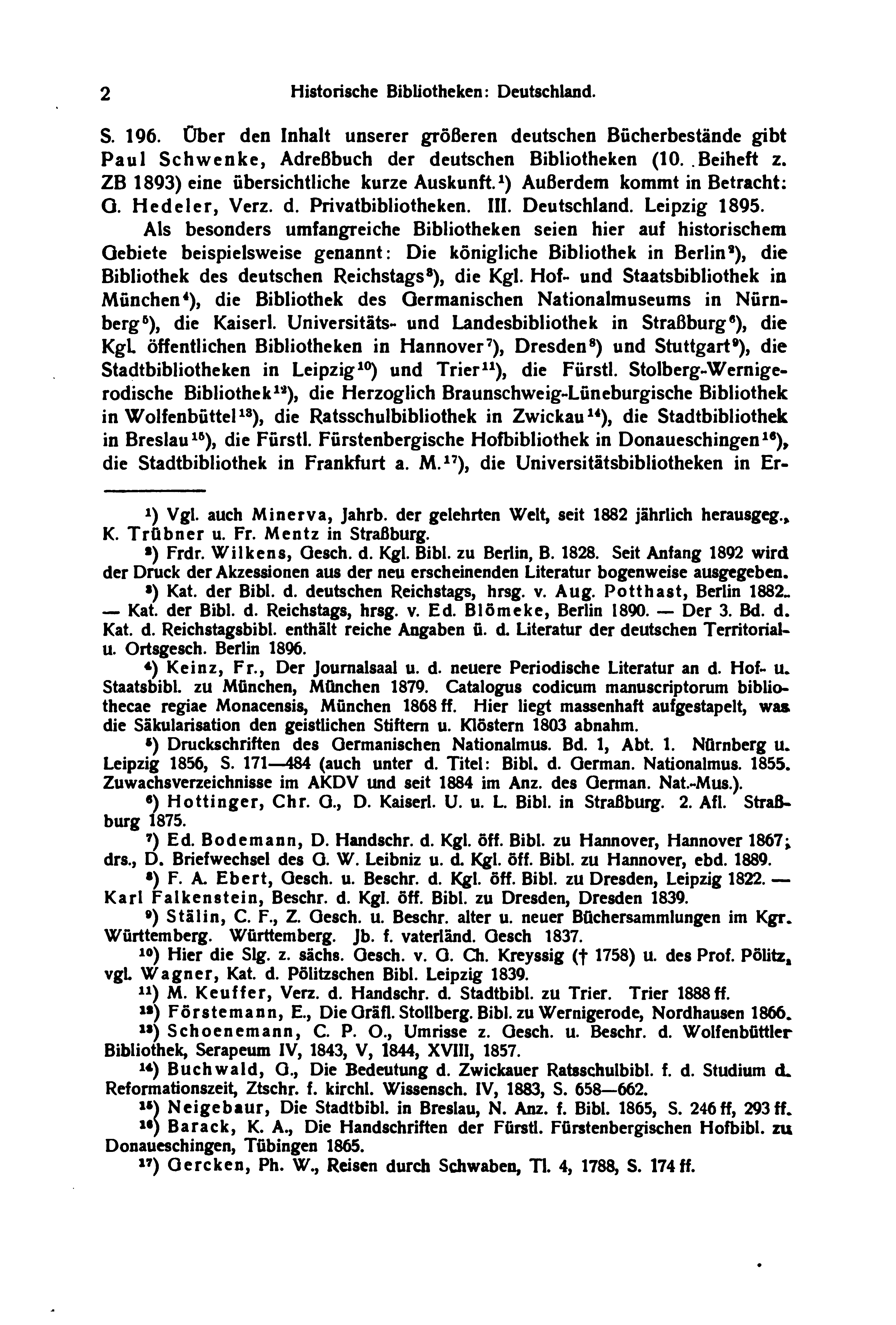Als besonders umfangreiche Bibliotheken seien hier auf historischem Gebiete beispielsweise genannt: Die königliche Bibliothek in Berlin[2], die Bibliothek des deutschen Reichstags[3], die Kgl. Hof- und Staatsbibliothek in München[4], die Bibliothek des Germanischen Nationalmuseums in Nürnberg[5], die Kaiserl. Universitäts- und Landesbibliothek in Straßburg[6], die Kgl. öffentlichen Bibliotheken in Hannover[7], Dresden[8] und Stuttgart[9], die Stadtbibliotheken in Leipzig[10] und Trier[11], die Fürstl. Stolberg-Wernigerodische Bibliothek[12], die Herzoglich Braunschweig-Lüneburgische Bibliothek in Wolfenbüttel[13], die Ratsschulbibliothek in Zwickau[14], die Stadtbibliothek in Breslau[15], die Fürstl. Fürstenbergische Hofbibliothek in Donaueschingen[16], die Stadtbibliothek in Frankfurt a. M.[17], die Universitätsbibliotheken in Erlangen[18],