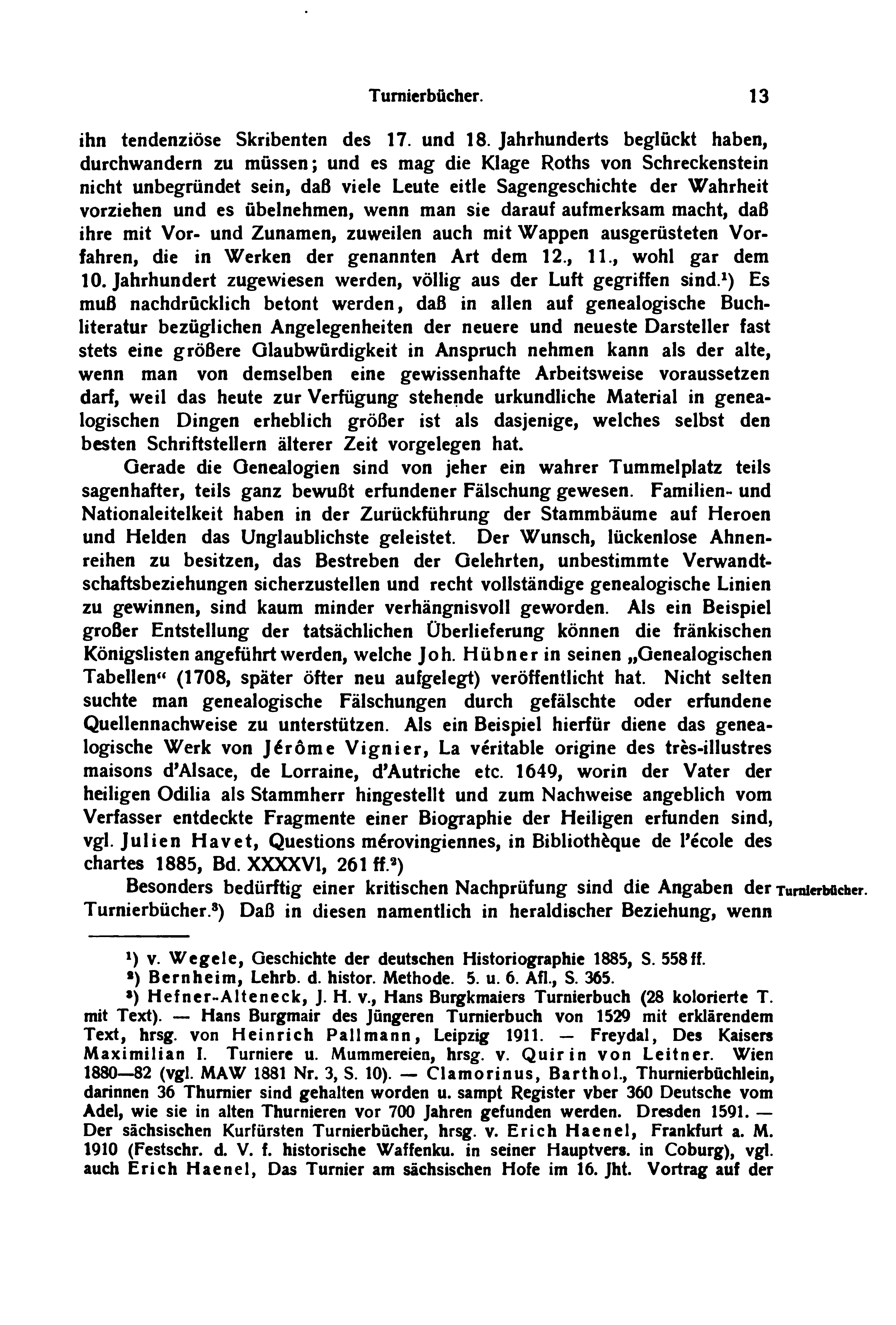 Gerade die Genealogien sind von jeher ein wahrer Tummelplatz teils sagenhafter, teils ganz bewußt erfundener Fälschung gewesen. Familien- und Nationaleitelkeit haben in der Zurückführung der Stammbäume auf Heroen und Helden das Unglaublichste geleistet. Der Wunsch, lückenlose Ahnenreihen zu besitzen, das Bestreben der Gelehrten, unbestimmte Verwandtschaftsbeziehungen sicherzustellen und recht vollständige genealogische Linien zu gewinnen, sind kaum minder verhängnisvoll geworden. Als ein Beispiel großer Entstellung der tatsächlichen Überlieferung können die fränkischen Königslisten angeführt werden, welche Joh. Hübner in seinen „Genealogischen Tabellen“ (1708, später öfter neu aufgelegt) veröffentlicht hat. Nicht selten suchte man genealogische Fälschungen durch gefälschte oder erfundene Quellennachweise zu unterstützen. Als ein Beispiel hierfür diene das genealogische Werk von Jérôme Vignier, La véritable origine des très-illustres maisons d'Alsace, de Lorraine, d'Autriche etc. 1649, worin der Vater der heiligen Odilia als Stammherr hingestellt und zum Nachweise angeblich vom Verfasser entdeckte Fragmente einer Biographie der Heiligen erfunden sind, vgl. Julien Havet, Questions mérovingiennes, in Bibliothèque de l'école des chartes 1885, Bd. XXXXVI, 261 ff.[2]