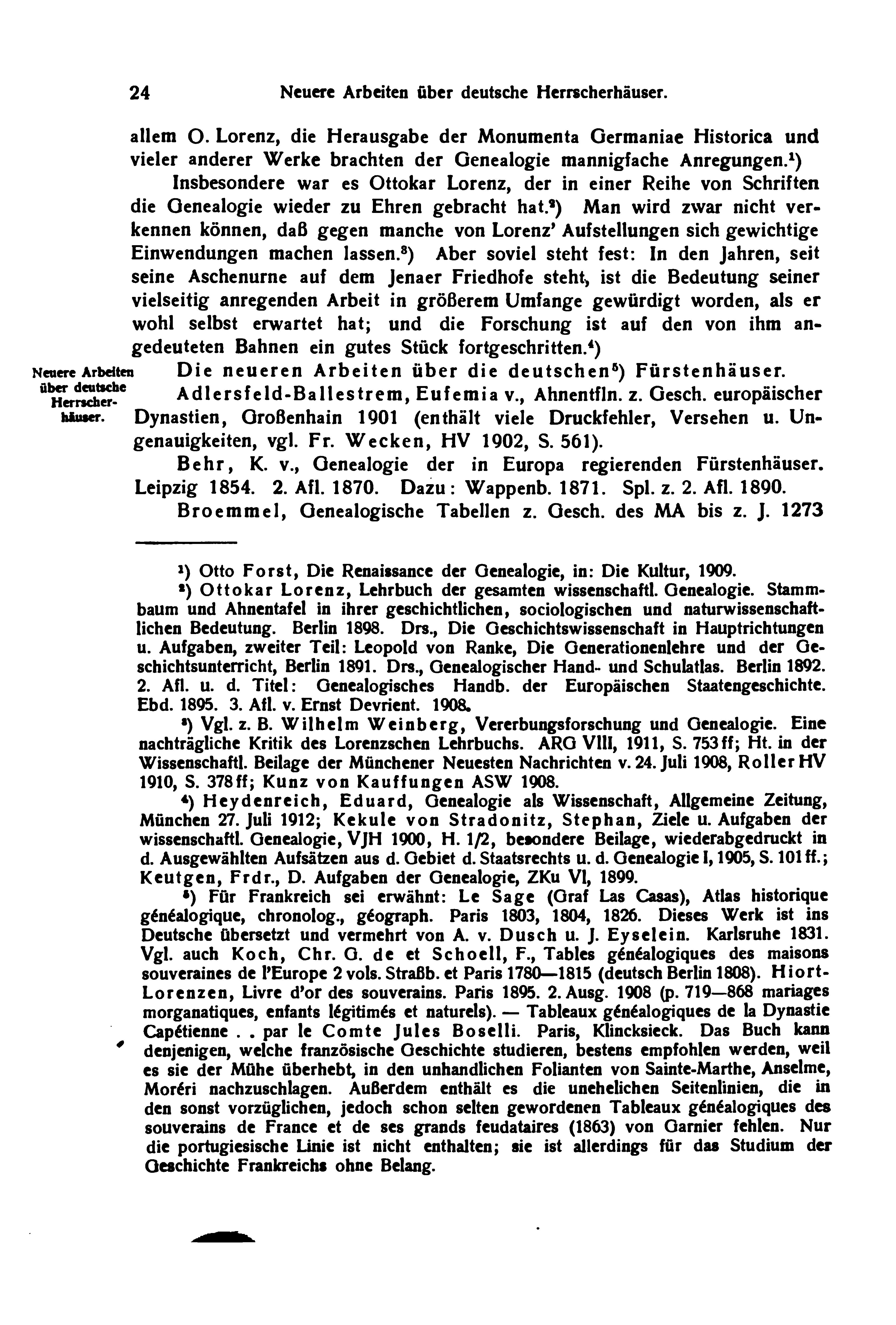 Insbesondere war es Ottokar Lorenz, der in einer Reihe von Schriften die Genealogie wieder zu Ehren gebracht hat.[2] Man wird zwar nicht verkennen können, daß gegen manche von Lorenz' Aufstellungen sich gewichtige Einwendungen machen lassen.[3] Aber soviel steht fest: In den Jahren, seit seine Aschenurne auf dem Jenaer Friedhofe steht, ist die Bedeutung seiner vielseitig anregenden Arbeit in größerem Umfange gewürdigt worden, als er wohl selbst erwartet hat; und die Forschung ist auf den von ihm angedeuteten Bahnen ein gutes Stück fortgeschritten.[4]