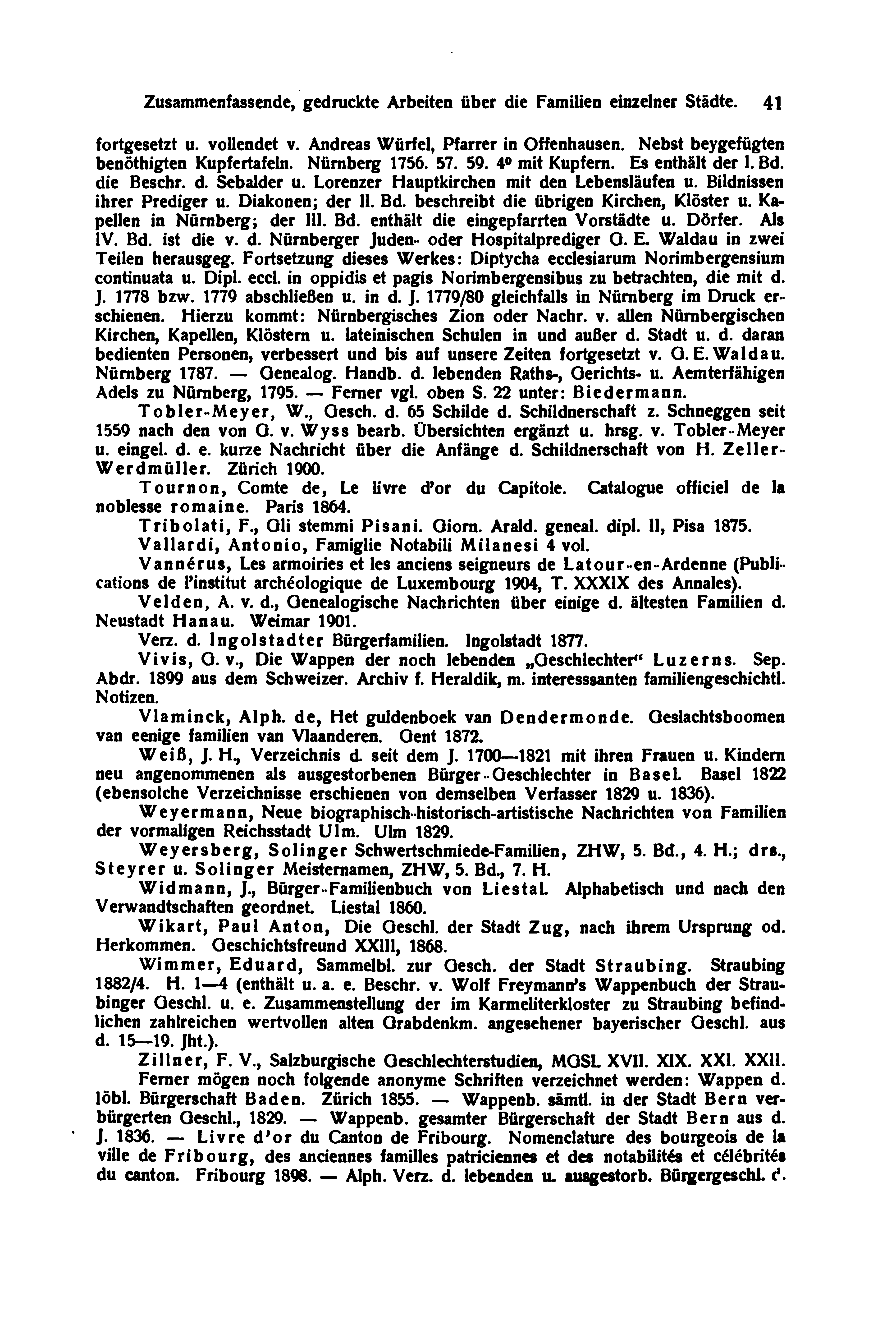fortgesetzt u. vollendet v. Andreas Würfel, Pfarrer in Offenhausen. Nebst beygefügten benöthigten Kupfertafeln. Nürnberg 1756. 57. 59. 4° mit Kupfern. Es enthält der I. Bd. die Beschr. d. Sebalder u. Lorenzer Hauptkirchen mit den Lebensläufen u. Bildnissen ihrer Prediger u. Diakonen; der II. Bd. beschreibt die übrigen Kirchen, Klöster u. Kapellen in Nürnberg; der III. Bd. enthält die eingepfarrten Vorstädte u. Dörfer. Als IV. Bd. ist die v. d. Nürnberger Juden- oder Hospitalprediger G. E. Waldau in zwei Teilen herausgeg. Fortsetzung dieses Werkes: Diptycha ecclesiarum Norimbergensium continuata u. Dipl. eccl. in oppidis et pagis Norimbergensibus zu betrachten, die mit d. J. 1778 bzw. 1779 abschließen u. in d. J. 1779/80 gleichfalls in Nürnberg im Druck erschienen. Hierzu kommt: Nürnbergisches Zion oder Nachr. v. allen Nürnbergischen Kirchen, Kapellen, Klöstern u. lateinischen Schulen in und außer d. Stadt u. d. daran bedienten Personen, verbessert und bis auf unsere Zeiten fortgesetzt v. G. E. Waldau. Nürnberg 1787. — Genealog. Handb. d. lebenden Raths-, Gerichts- u. Aemterfähigen Adels zu Nürnberg, 1795. — Ferner vgl. oben S. 22 unter: Biedermann.
