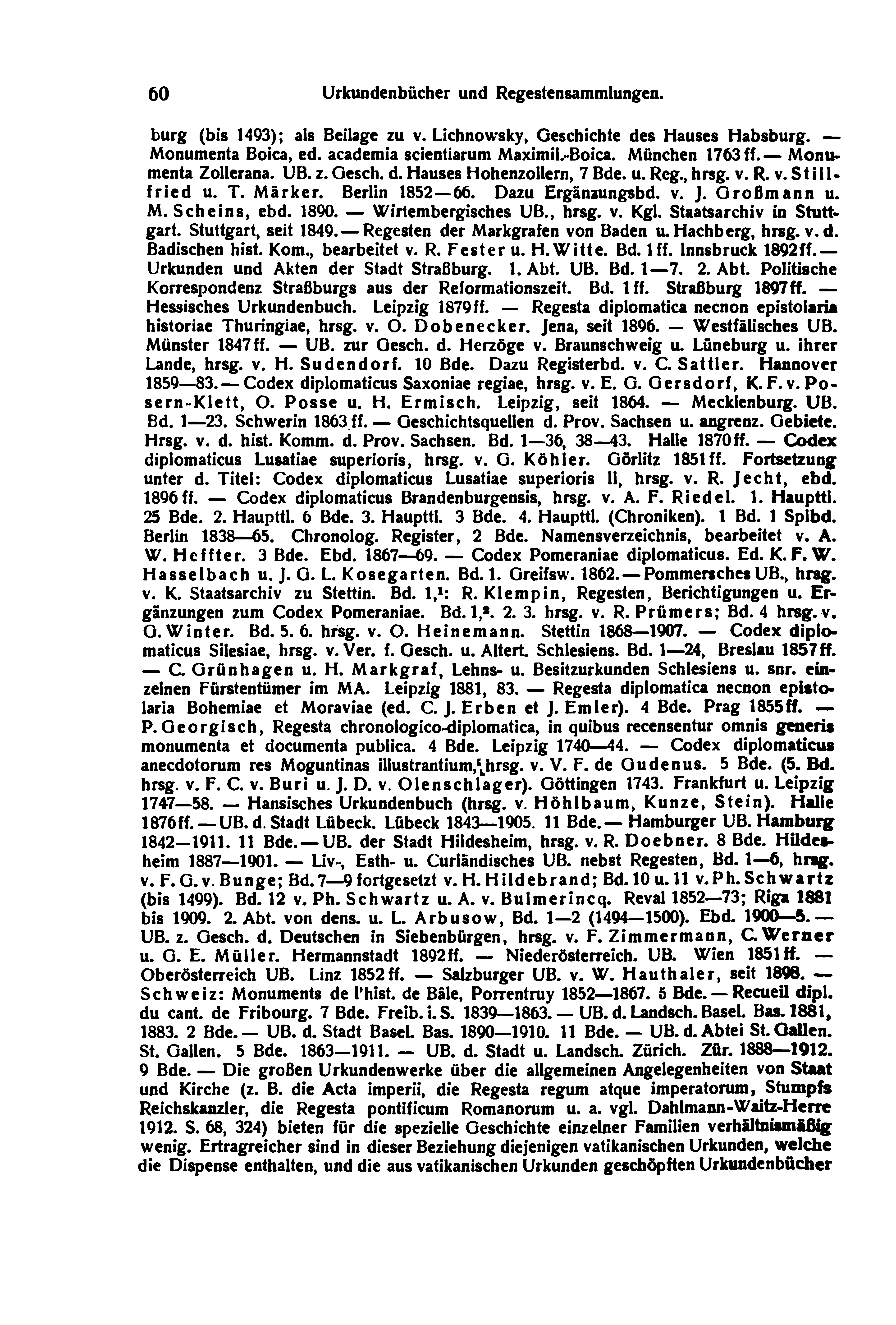 (bis 1493); als Beilage zu v. Lichnowsky, Geschichte des Hauses Habsburg. – Monumenta Boica, ed. academia scientiarum Maximil.-Boica. München 1763 ff. – Monumenta Zollerana. UB. z. Gesch. d. Hauses Hohenzollern, 7 Bde. u. Reg., hrsg. v. R. v. Stillfried u. T. Märker. Berlin 1852–66. Dazu Ergänzungsbd. v. J. Großmann u. M. Scheins, ebd. 1890. – Wirtembergisches UB., hrsg. v. Kgl. Staatsarchiv in Stuttgart. Stuttgart, seit 1849. – Regesten der Markgrafen von Baden u. Hachberg, hrsg. v. d. Badischen hist. Kom., bearbeitet v. R. Fester u. H. Witte. Bd. 1 ff. Innsbruck 1892 ff. – Urkunden und Akten der Stadt Straßburg. 1. Abt. UB. Bd. 1–7. 2. Abt. Politische Korrespondenz Straßburgs aus der Reformationszeit. Bd. 1 ff. Straßburg 1897 ff. – Hessisches Urkundenbuch. Leipzig 1879 ff. – Regesta diplomatica necnon epistolaria historiae Thuringiae, hrsg. v. O. Dobenecker. Jena, seit 1896. – Westfälisches UB. Münster 1847 ff. – UB. zur Gesch. d. Herzöge v. Braunschweig u. Lüneburg u. ihrer Lande, hrsg. v. H. Sudendorf. 10 Bde. Dazu Registerbd. v. C. Sattler. Hannover 1859–83. – Codex diplomaticus Saxoniae regiae, hrsg. v. E. G. Gersdorf, K. F. v. Posern-Klett, O. Posse u. H. Ermisch. Leipzig, seit 1864. – Mecklenburg. UB. Bd. 1–23. Schwerin 1863 ff. – Geschichtsquellen d. Prov. Sachsen u. angrenz. Gebiete. Hrsg. v. d. hist. Komm. d. Prov. Sachsen. Bd. 1–36, 38–43. Halle 1870 ff. – Codex diplomaticus Lusatiae superioris, hrsg. v. G. Köhler. Görlitz 1851 ff. Fortsetzung unter d. Titel: Codex diplomaticus Lusatiae superioris II, hrsg. v. R. Jecht, ebd. 1896 ff. – Codex diplomaticus Brandenburgensis, hrsg. v. A. F. Riedel. 1. Haupttl. 25 Bde. 2. Haupttl. 6 Bde. 3. Haupttl. 3 Bde. 4. Haupttl. (Chroniken). 1 Bd. 1 Splbd. Berlin 1838–65. Chronolog. Register, 2 Bde. Namensverzeichnis, bearbeitet v. A. W. Heffter. 3 Bde. Ebd. 1867–69. – Codex Pomeraniae diplomaticus. Ed. K. F. W. Hasselbach u. J. G. L. Kosegarten. Bd. 1. Greifsw. 1862. – Pommersches UB., hrsg. v. K. Staatsarchiv zu Stettin. Bd. 1,1: R. Klempin, Regesten, Berichtigungen u. Ergänzungen zum Codex Pomeraniae. Bd. 1,2 2. 3. hrsg. v. R. Prümers; Bd. 4 hrsg. v. G. Winter. Bd. 5. 6. hrsg. v. O. Heinemann. Stettin 1868–1907. – Codex diplomaticus Silesiae, hrsg. v. Ver. f. Gesch. u. Altert. Schlesiens. Bd. 1–24, Breslau 1857 ff. – C. Grünhagen u. H. Markgraf, Lehns- u. Besitzurkunden Schlesiens u. snr. einzelnen Fürstentümer im MA. Leipzig 1881, 83. – Regesta diplomatica necnon epistolaria Bohemiae et Moraviae (ed. C. J. Erben et J. Emler). 4 Bde. Prag 1855 ff. – P. Georgisch, Regesta chronologico-diplomatica, in quibus recensentur omnis generis monumenta et documenta publica. 4 Bde. Leipzig 1740–44. – Codex diplomaticus anecdotorum res Moguntinas illustrantium, hrsg. v. V. F. de Gudenus. 5 Bde. (5. Bd. hrsg. v. F. C. v. Buri u. J. D. v. Olenschlager). Göttingen 1743. Frankfurt u. Leipzig 1747–58. – Hansisches Urkundenbuch (hrsg. v. Höhlbaum, Kunze, Stein). Halle 1876 ff. – UB. d. Stadt Lübeck. Lübeck 1843–1905. 11 Bde. – Hamburger UB. Hamburg 1842–1911. 11 Bde. – UB. der Stadt Hildesheim, hrsg. v. R. Doebner. 8 Bde. Hildesheim 1887–1901. – Liv-, Esth- u. Curländisches UB. nebst Regesten, Bd. 1–6, hrsg. v. F. G. v. Bunge; Bd. 7– 9 fortgesetzt v. H. Hildebrand; Bd. 10 u. 11 v. Ph. Schwartz (bis 1499). Bd. 12 v. Ph. Schwartz u. A. v. Bulmerincq. Reval 1852–73; Riga 1881 bis 1909. 2. Abt. von dens. u. L. Arbusow, Bd. 1–2 (1494–1500). Ebd. 1900–5.– UB. z. Gesch. d. Deutschen in Siebenbürgen, hrsg. v. F. Zimmermann, C. Werner u. G. E. Müller. Hermannstadt 1892 ff. – Niederösterreich. UB. Wien 1851 ff. – Oberösterreich UB. Linz 1852 ff. – Salzburger UB. v. W. Hauthaler, seit 1898. – Schweiz: Monuments de l'hist. de Bâle, Porrentruy 1852–1867. 5 Bde. – Recueil dipl. du cant. de Fribourg. 7 Bde. Freib. i. S. 1839–1863. – UB. d. Landsch. Basel. Bas. 1881, 1883. 2 Bde.– UB. d. Stadt Basel. Bas. 1890–1910. 11 Bde. – UB. d. Abtei St. Gallen. St. Gallen. 5 Bde. 1863–1911. – UB. d. Stadt u. Landsch. Zürich. Zür. 1888–1912. 9 Bde. – Die großen Urkundenwerke über die allgemeinen Angelegenheiten von Staat und Kirche (z. B. die Acta imperii, die Regesta regum atque imperatorum, Stumpfs Reichskanzler, die Regesta pontificum Romanorum u. a. vgl. Dahlmann-Waitz-Herre 1912. S. 68, 324) bieten für die spezielle Geschichte einzelner Familien verhältnismäßig wenig. Ertragreicher sind in dieser Beziehung diejenigen vatikanischen Urkunden, welche die Dispense enthalten, und die aus vatikanischen Urkunden geschöpften Urkundenbücher