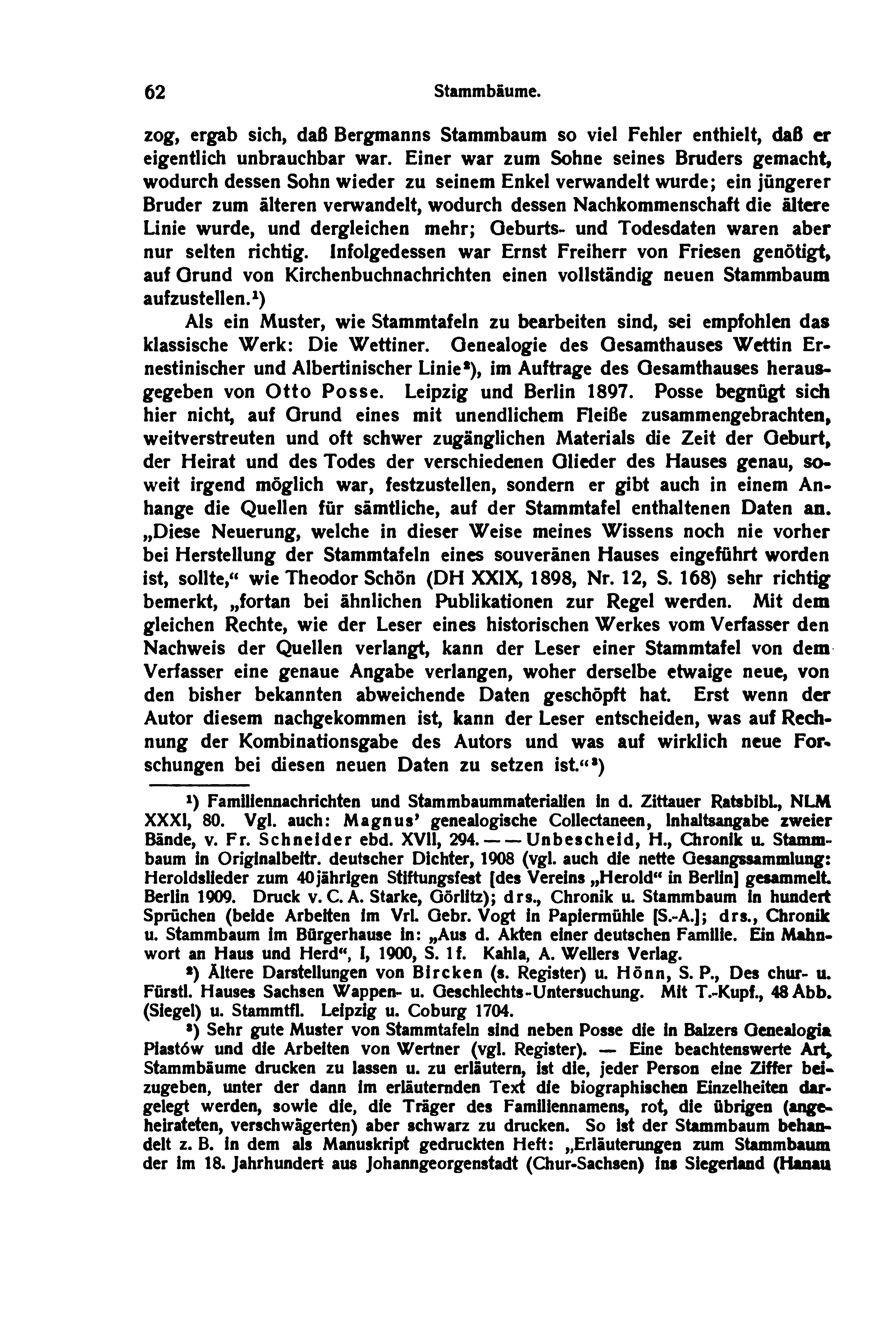 Als ein Muster, wie Stammtafeln zu bearbeiten sind, sei empfohlen das klassische Werk: Die Wettiner. Genealogie des Gesamthauses Wettin Ernestinischer und Albertinischer Linie[2], im Auftrage des Gesamthauses herausgegeben von Otto Posse. Leipzig und Berlin 1897. Posse begnügt sich hier nicht, auf Grund eines mit unendlichem Fleiße zusammengebrachten, weitverstreuten und oft schwer zugänglichen Materials die Zeit der Geburt, der Heirat und des Todes der verschiedenen Glieder des Hauses genau, soweit irgend möglich war, festzustellen, sondern er gibt auch in einem Anhange die Quellen für sämtliche, auf der Stammtafel enthaltenen Daten an. „Diese Neuerung, welche in dieser Weise meines Wissens noch nie vorher bei Herstellung der Stammtafeln eines souveränen Hauses eingeführt worden ist, sollte,“ wie Theodor Schön (DH XXIX, 1898, Nr. 12, S. 168) sehr richtig bemerkt, „fortan bei ähnlichen Publikationen zur Regel werden. Mit dem gleichen Rechte, wie der Leser eines historischen Werkes vom Verfasser den Nachweis der Quellen verlangt, kann der Leser einer Stammtafel von dem Verfasser eine genaue Angabe verlangen, woher derselbe etwaige neue, von den bisher bekannten abweichende Daten geschöpft hat. Erst wenn der Autor diesem nachgekommen ist, kann der Leser entscheiden, was auf Rechnung der Kombinationsgabe des Autors und was auf wirklich neue Forschungen bei diesen neuen Daten zu setzen ist.“[3][GWR 1]