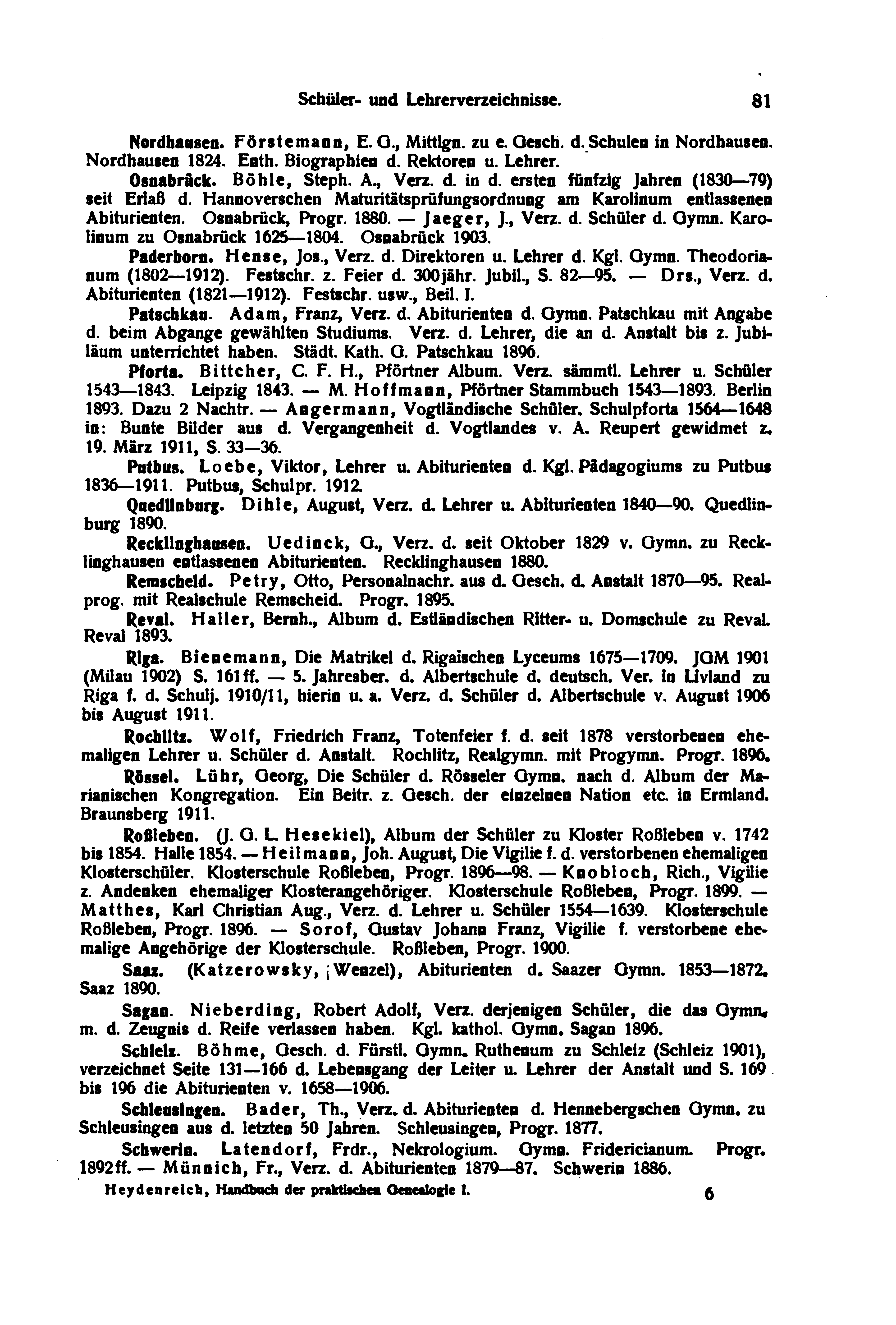 Schleiz. Böhme, Gesch. d. Fürstl. Gymn. Ruthenum zu Schleiz (Schleiz 1901), verzeichnet Seite 131—166 d. Lebensgang der Leiter u. Lehrer der Anstalt und S. 169 bis 196 die Abiturienten v. 1658—1906.