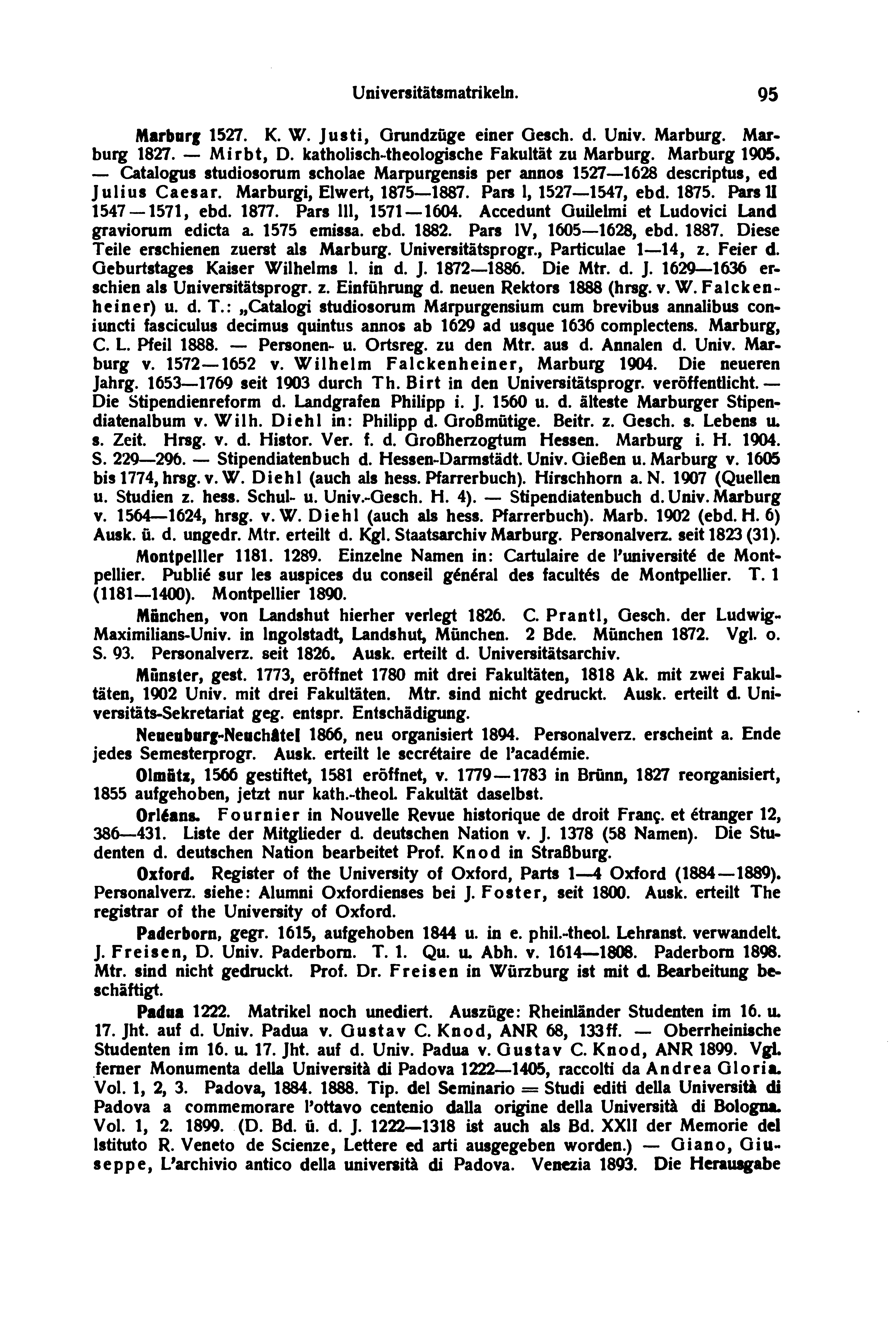 Marburg 1527. K. W. Justi, Grundzüge einer Gesch. d. Univ. Marburg. Marburg 1827. - Mirbt, D. katholisch-theologische Fakultät zu Marburg. Marburg 1905. - Catalogus studiosorum scholae Marpurgensis per annos 1527-1628 descriptus, ed Julius Caesar. Marburgi, Elwert, 1875-1887. Pars I, 1527-1547, ebd. 1875. Pars II 1547-1571, ebd. 1877. Pars III, 1571-1604. Accedunt Guilelmi et Ludovici Land graviorum edicta a. 1575 emissa. ebd. 1882. Pars IV, 1605-1628, ebd. 1887. Diese Teile erschienen zuerst als Marburg. Universitätsprogr., Particulae 1-14, z. Feier d. Geburtstages Kaiser Wilhelms I. in d. J. 1872-1886. Die Mtr. d. J. 1629-1636 erschien als Universitätsprogr. z. Einführung d. neuen Rektors 1888 (hrsg. v. W. Falckenheiner) u. d. T.: „Catalogi studiosorum Marpurgensium cum brevibus annalibus coniuncti fasciculus decimus quintus annos ab 1629 ad usque 1636 complectens. Marburg, C. L. Pfeil 1888. - Personen- u. Ortsreg. zu den Mtr. aus d. Annalen d. Univ. Marburg v. 1572-1652 v. Wilhelm Falckenheiner, Marburg 1904. Die neueren Jahrg. 1653-1769 seit 1903 durch Th. Birt in den Universitätsprogr. veröffentlicht.- Die Stipendienreform d. Landgrafen Philipp i. J. 1560 u. d. älteste Marburger Stipendiatenalbum v. Wilh. Diehl in: Philipp d. Großmütige. Beitr. z. Gesch. s. Lebens u. s. Zeit. Hrsg. v. d. Histor. Ver. f. d. Großherzogtum Hessen. Marburg i. H. 1904. S. 229-296. - Stipendiatenbuch d. Hessen-Darmstädt. Univ. Gießen u. Marburg v. 1605 bis 1774, hrsg. v. W. Diehl (auch als hess. Pfarrerbuch). Hirschhorn a. N. 1907 (Quellen u. Studien z. hess. Schul- u. Univ.-Gesch. H. 4). - Stipendiatenbuch d. Univ. Marburg v. 1564-1624, hrsg. v. W. Diehl (auch als hess. Pfarrerbuch). Marb. 1902 (ebd. H. 6) Ausk. ü. d. ungedr. Mtr. erteilt d. Kgl. Staatsarchiv Marburg. Personalverz. seit 1823 (31).