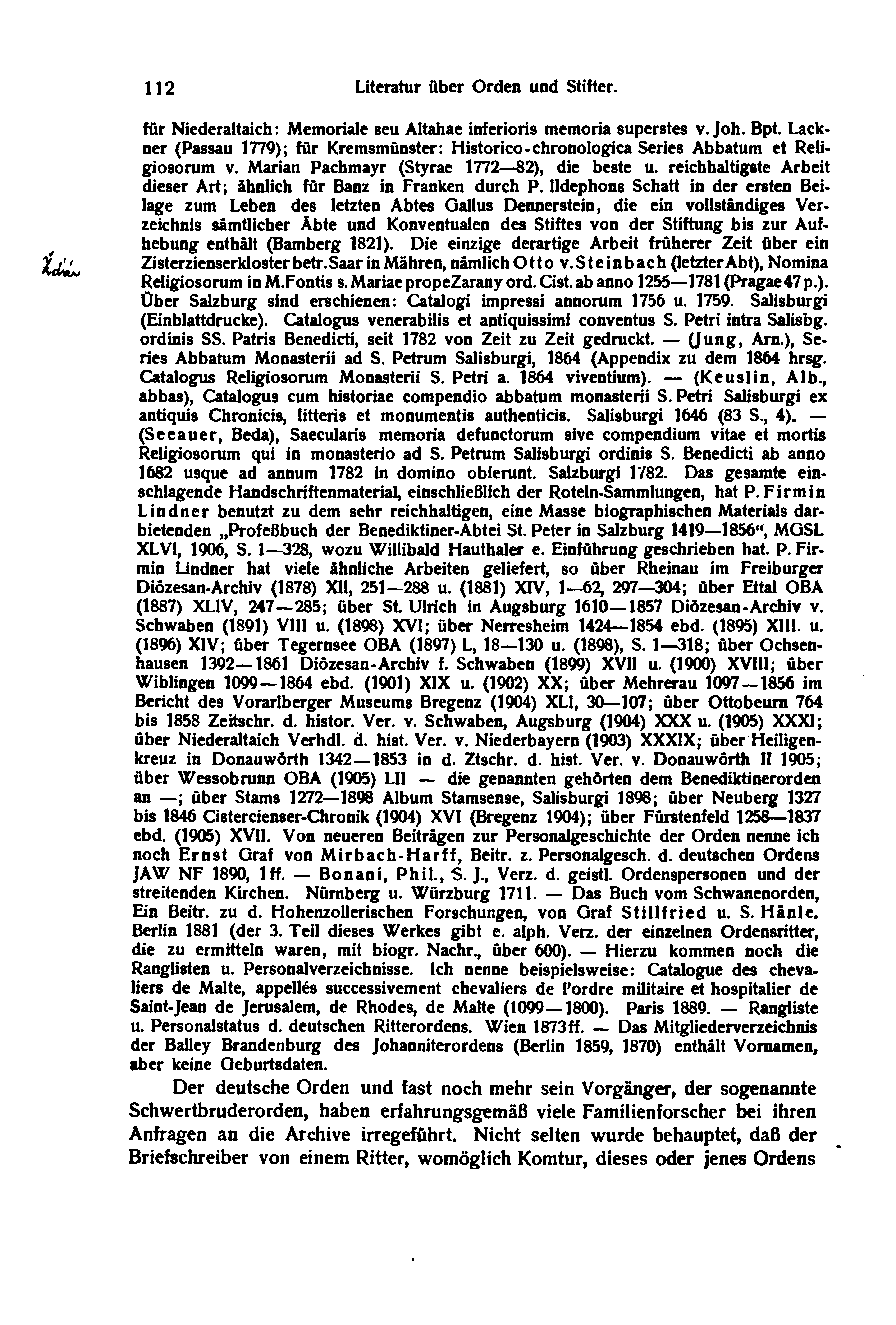 für Niederaltaich: Memoriale seu Altahae inferioris memoria superstes v. Joh. Bpt. Lackner (Passau 1779); für Kremsmünster: Historico-chronologica Series Abbatum et Religiosorum v. Marian Pachmayr (Styrae 1772-82), die beste u. reichhaltigste Arbeit dieser Art; ähnlich für Banz in Franken durch P. Ildephons Schatt in der ersten Beilage zum Leben des letzten Abtes Gallus Dennerstein, die ein vollständiges Verzeichnis sämtlicher Ãbte und Konventualen des Stiftes von der Stiftung bis zur Aufhebung enthält (Bamberg 1821). Die einzige derartige Arbeit früherer Zeit über ein Zisterzienserkloster betr. Saar in Mähren, nämlich Otto v. Steinbach (letzter Abt), Nomina Religiosorum in M. Fontis s. Mariae prope Zarany ord. Cist. ab anno 1255-1781 (Pragae 47 p.). Über Salzburg sind erschienen: Catalogi impressi annorum 1756 u. 1759. Salisburgi (Einblattdrucke). Catalogus venerabilis et antiquissimi conventus S. Petri intra Salisbg. ordinis SS. Patris Benedicti, seit 1782 von Zeit zu Zeit gedruckt. - (Jung, Arn.), Series Abbatum Monasterii ad S. Petrum Salisburgi, 1864 (Appendix zu dem 1864 hrsg. Catalogus Religiosorum Monasterii S. Petri a. 1864 viventium). - (Keuslin, Alb., abbas), Catalogus cum historiae compendio abbatum monasterii S. Petri Salisburgi ex antiquis Chronicis, litteris et monumentis authenticis. Salisburgi 1646 (83 S., 4). - (Seeauer, Beda), Saecularis memoría defunctorum sive compendium vitae et mortis Religiosorum qui in monasterio ad S. Petrum Salisburgi ordinis S. Benedicti ab anno 1682 usque ad annum 1782 in domino obierunt. Salzburgi 1782. Das gesamte einschlagende Handschriftenmaterial, einschließlich der Roteln-Sammlungen, hat P. Firmin Lindner benutzt zu dem sehr reichhaltigen, eine Masse biographischen Materials darbietenden „Profeßbuch der Benediktiner-Abtei St. Peter in Salzburg 1419-1856“, MGSL XLVI, 1906, S. 1-328, wozu Willibald Hauthaler e. Einführung geschrieben hat. P. Firmin Lindner hat viele ähnliche Arbeiten geliefert, so über Rheinau im Freiburger Diözesan-Archiv (1878) XII, 251-288 u. (1881) XIV, 1-62, 297-304; über Ettal OBA (1887) XLIV, 247-285; über St. Ulrich in Augsburg 1610-1857 Diözesan-Archiv v. Schwaben (1891) VIII u. (1898) XVI; über Nerresheim 1424-1854 ebd. (1895) XIII. u. (1896) XIV; über Tegernsee OBA (1897) L, 18-130 u. (1898), S. 1-318; über Ochsenhausen 1392-1861 Diözesan-Archiv f. Schwaben (1899) XVII u. (1900) XVIII; über Wiblingen 1099-1864 ebd. (1901) XIX u. (1902) XX; über Mehrerau 1097-1856 im Bericht des Vorarlberger Museums Bregenz (1904) XLI, 30-107; über Ottobeurn 764 bis 1858 Zeitschr. d. histor. Ver. v. Schwaben, Augsburg (1904) XXX u. (1905) XXXI; über Niederaltaich Verhdl. d. hist. Ver. v. Niederbayern (1903) XXXIX; über Heiligenkreuz in Donauwörth 1342-1853 in d. Ztschr. d. hist. Ver. v. Donauwörth II 1905; über Wessobrunn OBA (1905) LII - die genannten gehörten dem Benediktinerorden an -; über Stams 1272-1898 Album Stamsense, Salisburgi 1898; über Neuberg 1327 bis 1846 Cistercienser-Chronik (1904) XVI (Bregenz 1904); über Fürstenfeld 1258-1837 ebd. (1905) XVII. Von neueren Beiträgen zur Personalgeschichte der Orden nenne ich noch Ernst Graf von Mirbach-Harff, Beitr. z. Personalgesch. d. deutschen Ordens JAW NF 1890, 1ff. - Bonani, Phil., S. J., Verz. d. geistl. Ordenspersonen und der streitenden Kirchen. Nürnberg u. Würzburg 1711. - Das Buch vom Schwanenorden, Ein Beitr. zu d. Hohenzollerischen Forschungen, von Graf Stillfried u. S. Hânle. Berlin 1881 (der 3. Teil dieses Werkes gibt e. alph. Verz. der einzelnen Ordensritter, die zu ermitteln waren, mit biogr. Nachr., über 600). - Hierzu kommen noch die Ranglisten u. Personalverzeichnisse. lch nenne beispielsweise: Catalogue des chevaliers de Malte, appellés successivement chevaliers de l'ordre militaire et hospitalier de Saint-Jean de Jerusalem, de Rhodes, de Malte (1099-1800). Paris 1889. - Rangliste u. Personalstatus d. deutschen Ritterordens. Wien 1873ff. - Das Mitgliederverzeichnis der Balley Brandenburg des Johanniterordens (Berlin 1859, 1870) enthält Vornamen, aber keine Geburtsdaten.