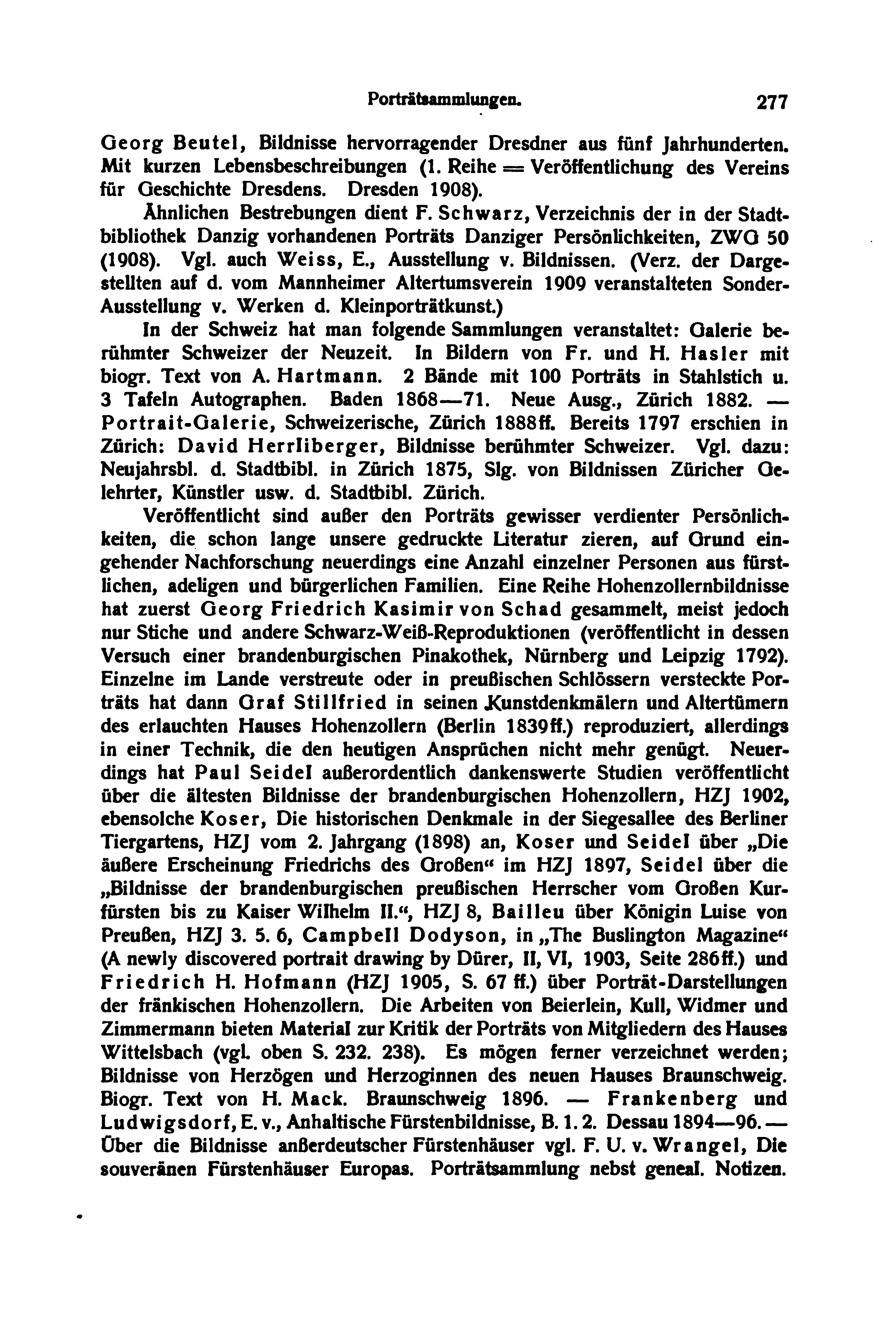 Veröffentlicht sind außer den Porträts gewisser verdienter Persönlichkeiten, die schon lange unsere gedruckte Literatur zieren, auf Grund eingehender Nachforschung neuerdings eine Anzahl einzelner Personen aus fürstlichen, adeligen und bürgerlichen Familien. Eine Reihe Hohenzollernbildnisse hat zuerst Georg Friedrich Kasimir von Schad gesammelt, meist jedoch nur Stiche und andere Schwarz-Weiß-Reproduktionen (veröffentlicht in dessen Versuch einer brandenburgischen Pinakothek, Nürnberg und Leipzig 1792). Einzelne im Lande verstreute oder in preußischen Schlössern versteckte Portrats hat dann Graf Stillfried in seinen Kunstdenkmälern und Altertümern des erlauchten Hauses Hohenzollern (Berlin 1839 ff.) reproduziert, allerdings in einer Technik, die den heutigen Ansprüchen nicht mehr genügt. Neuerdings hat Paul Seidel außerordentlich dankenswerte Studien veröffentlicht über die ältesten Bildnisse der brandenburgischen Hohenzollern, HZJ 1902, ebensolche Koser, Die historischen Denkmale in der Siegesallee des Berliner Tiergartens, HZJ vom 2. Jahrgang (1898) an, Koser und Seidel über „Die äußere Erscheinung Friedrichs des Großen“ im HZJ 1897, Seidel über die „Bildnisse der brandenburgischen preußischen Herrscher vom Großen Kurfürsten bis zu Kaiser Wilhelm II.“, HZJ 8, Bailleu über Königin Luise von Preußen, HZJ 3. 5. 6, Campbell Dodyson, in „The Buslington Magazine“ (A newly discovered portrait drawing by Dürer, II, VI, 1903, Seite 286 ff.) und Friedrich H. Hofmann (HZJ 1905, S. 67 ff.) über Porträt-Darstellungen der fränkischen Hohenzollern. Die Arbeiten von Beierlein, Kull, Widmer und Zimmermann bieten Material zur Kritik der Porträts von Mitgliedern des Hauses Wittelsbach (vgl. oben S. 232. 238). Es mögen ferner verzeichnet werden; Bildnisse von Herzögen und Herzoginnen des neuen Hauses Braunschweig. Biogr. Text von H. Mack. Braunschweig 1896. — Frankenberg und Ludwigsdorf, E. v., Anhaltische Fürstenbildnisse, B. 1. 2. Dessau 1894—96. — Über die Bildnisse anßerdeutscher Fürstenhäuser vgl. F. U. v. Wrangel, Die souveränen Fürstenhäuser Europas. Porträtsammlung nebst geneal. Notizen.