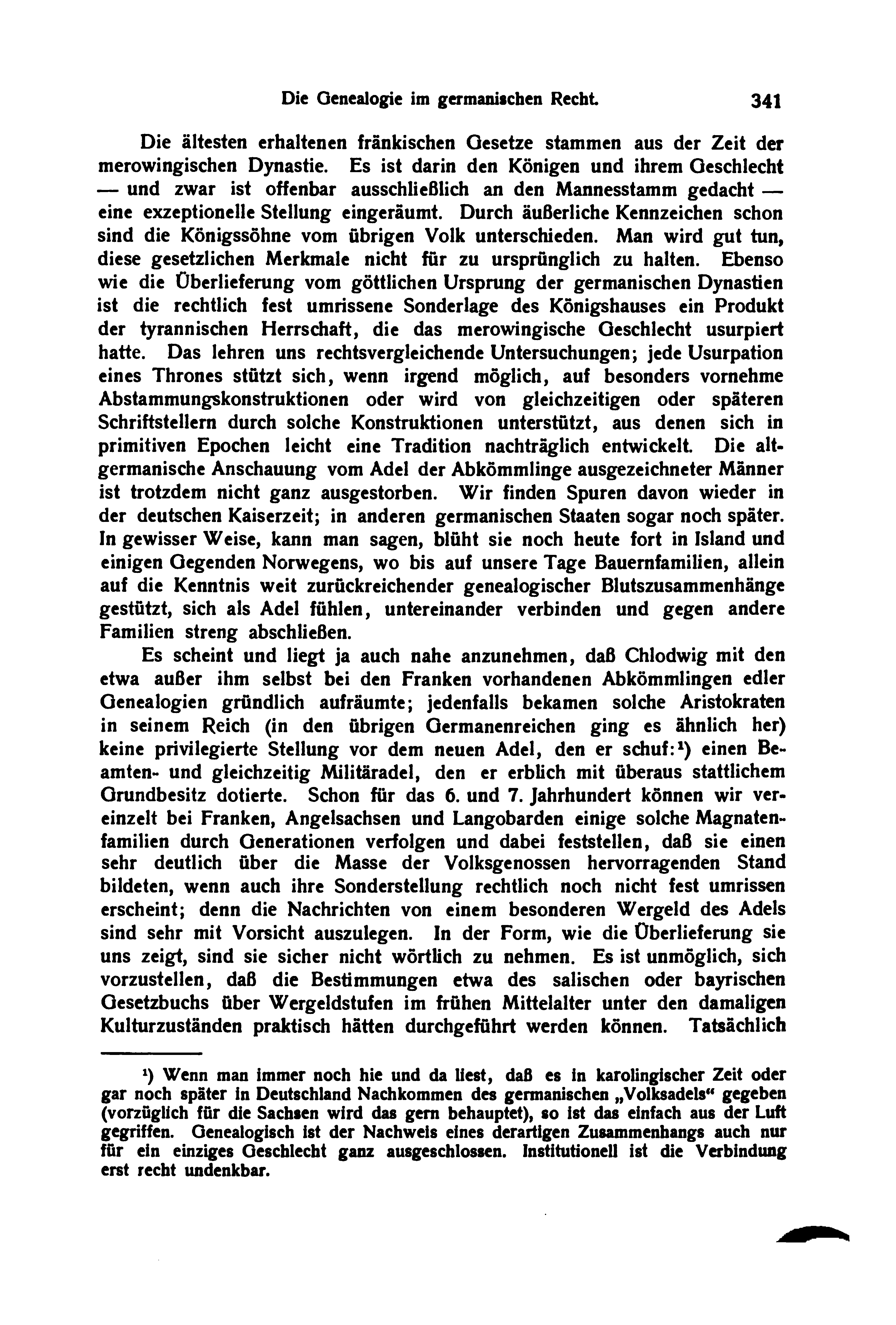 - ↑ Wenn man immer noch hie und da liest, daß es in karolingischer Zeit oder gar noch später in Deutschland Nachkommen des germanischen „Volksadels" gegeben (vorzüglich für die Sachsen wird das gern behauptet), so ist das einfach aus der Luft gegriffen. Genealogisch ist der Nachweis eines derartigen Zusammenhangs auch nur für ein einziges Geschlecht ganz ausgeschlossen. Institutionell ist die Verbindung erst recht undenkbar.