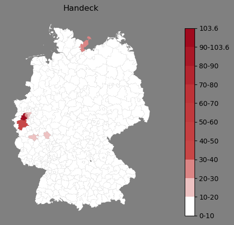 Absolute Verteilung des Namens Handeck (1890)Direkt zur Karte Absolute Verteilung des Namens "Handeck" um 1890 im damaligen Deutschen Reich Sie können die Karte innerhalb des Fensters zoomen und verschieben. |