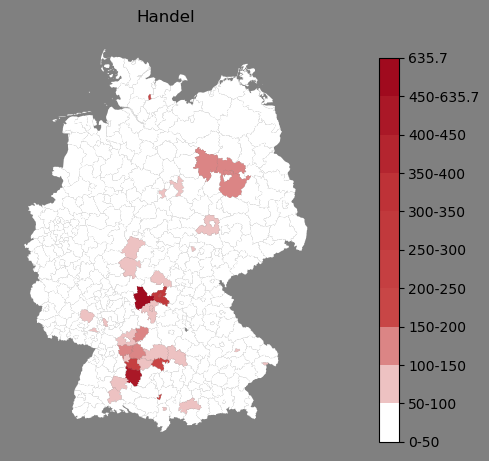 Relative Verteilung des Namens Handel (1996)Direkt zur Karte Die Farbskala zeigt die Anzahl von "Handel" bezogen auf je 1 Million Einträge. |