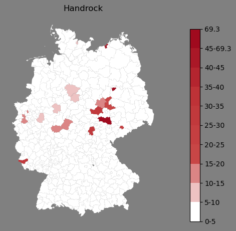 Relative Verteilung des Namens Handrock (1996)Direkt zur Karte Die Farbskala zeigt die Anzahl von "Handrock" bezogen auf je 1 Million Einträge. |