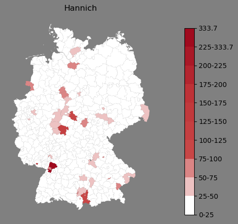 Absolute Verteilung des Namens Hannich (1890)Direkt zur Karte Absolute Verteilung des Namens "Hannich" um 1890 im damaligen Deutschen Reich Sie können die Karte innerhalb des Fensters zoomen und verschieben. |