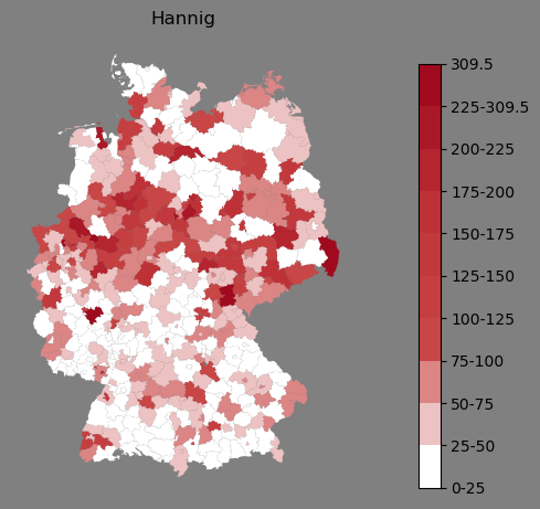 Relative Verteilung des Namens Hannig (1996)Direkt zur Karte Die Farbskala zeigt die Anzahl von "Hannig" bezogen auf je 1 Million Einträge. |