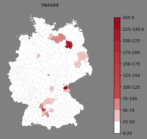 Relative Verteilung des Namens Hanold (1996)Direkt zur Karte Die Farbskala zeigt die Anzahl von "Hanold" bezogen auf je 1 Million Einträge. |