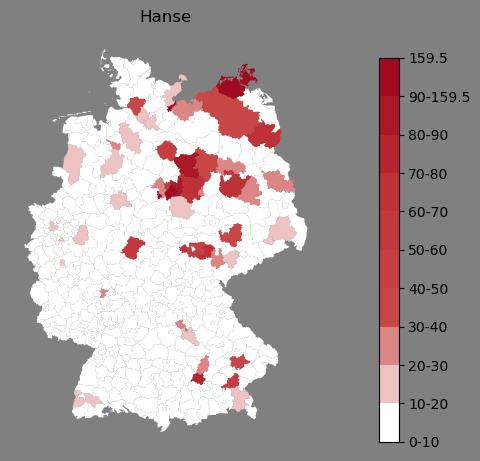 Relative Verteilung des Namens Hanse (1996)Direkt zur Karte Die Farbskala zeigt die Anzahl von "Hanse" bezogen auf je 1 Million Einträge. |
