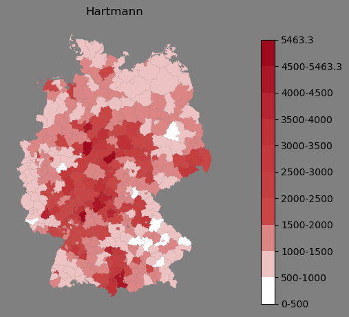 Absolute Verteilung des Namens Hartmann (1890)Direkt zur Karte Absolute Verteilung des Namens "Hartmann" um 1890 im damaligen Deutschen Reich Sie können die Karte innerhalb des Fensters zoomen und verschieben. |