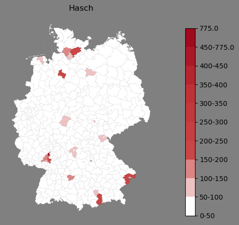 Relative Verteilung des Namens Hasch (1996)Direkt zur Karte Die Farbskala zeigt die Anzahl von "Hasch" bezogen auf je 1 Million Einträge. |