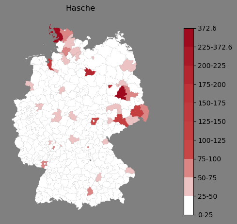 Relative Verteilung des Namens Hasche (1996)Direkt zur Karte Die Farbskala zeigt die Anzahl von "Hasche" bezogen auf je 1 Million Einträge. |