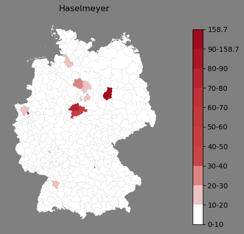 Relative Verteilung des Namens Haselmeyer (1996)Direkt zur Karte Die Farbskala zeigt die Anzahl von "Haselmeyer" bezogen auf je 1 Million Einträge. |