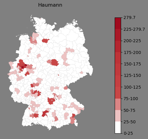 Absolute Verteilung des Namens Haumann (1890)Direkt zur Karte Absolute Verteilung des Namens "Haumann" um 1890 im damaligen Deutschen Reich Sie können die Karte innerhalb des Fensters zoomen und verschieben. |
