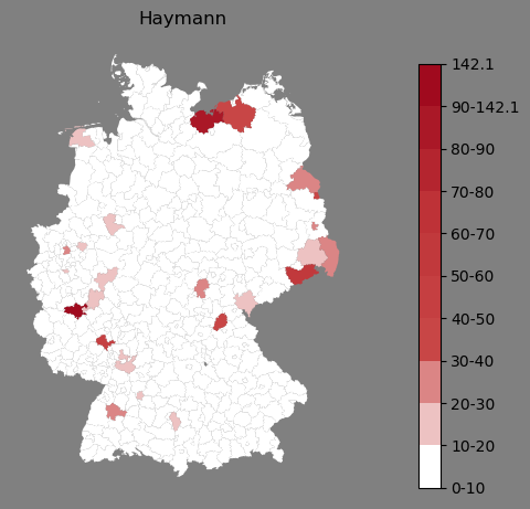 Relative Verteilung des Namens Haymann (1996)Direkt zur Karte Die Farbskala zeigt die Anzahl von "Haymann" bezogen auf je 1 Million Einträge. |