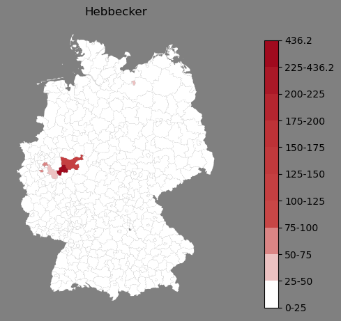 Relative Verteilung des Namens Hebbecker (1996)Direkt zur Karte Die Farbskala zeigt die Anzahl von "Hebbecker" bezogen auf je 1 Million Einträge. |