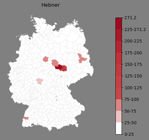 Relative Verteilung des Namens Hebner (1996)Direkt zur Karte Die Farbskala zeigt die Anzahl von "Hebner" bezogen auf je 1 Million Einträge. |