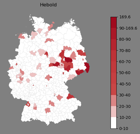Relative Verteilung des Namens Hebold (1996)Direkt zur Karte Die Farbskala zeigt die Anzahl von "Hebold" bezogen auf je 1 Million Einträge. |
