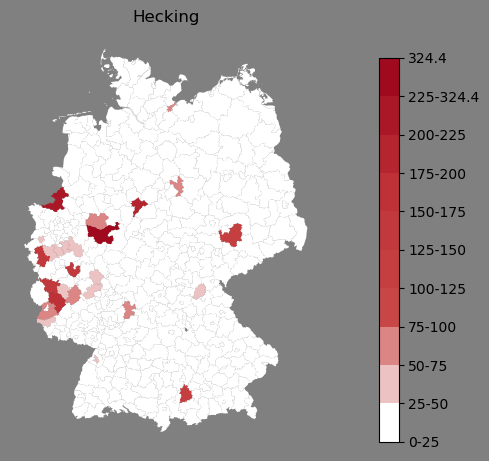 Relative Verteilung des Namens Hecking (1996)Direkt zur Karte Die Farbskala zeigt die Anzahl von "Hecking" bezogen auf je 1 Million Einträge. |