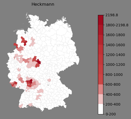 Relative Verteilung des Namens Heckmann (1996)Direkt zur Karte Die Farbskala zeigt die Anzahl von "Heckmann" bezogen auf je 1 Million Einträge. |