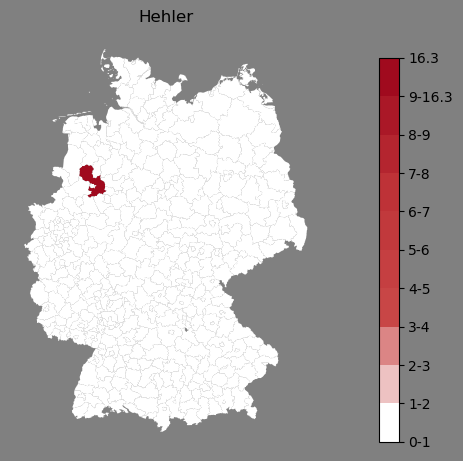 Relative Verteilung des Namens Hehler (1996)Direkt zur Karte Die Farbskala zeigt die Anzahl von "Hehler" bezogen auf je 1 Million Einträge. |