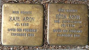 - Hier wohnte Karl Aron, Jg. 1882, Opfer der Pogroms, ermordet 1938
