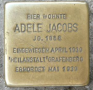 - Hier wohnte Adele Jacobs, Jg. 1888, eingewiesen April 1939, 'Heilanstalt' Grafenberg, ermordet Mai 1939