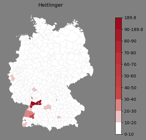 Relative Verteilung des Namens Heitlinger (1996)Direkt zur Karte Die Farbskala zeigt die Anzahl von "Heitlinger" bezogen auf je 1 Million Einträge. |