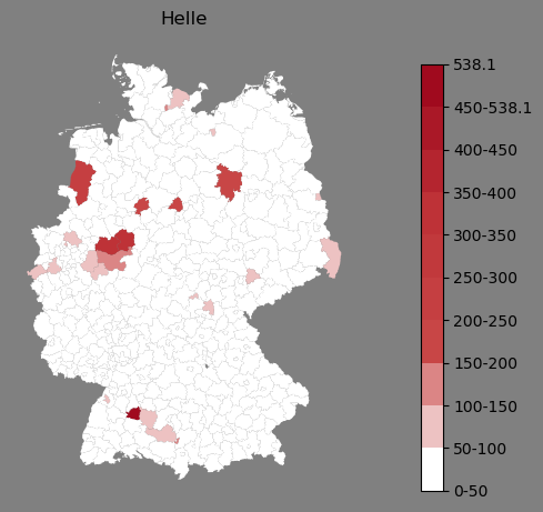 Relative Verteilung des Namens Helle (1996)Direkt zur Karte Die Farbskala zeigt die Anzahl von "Helle" bezogen auf je 1 Million Einträge. |
