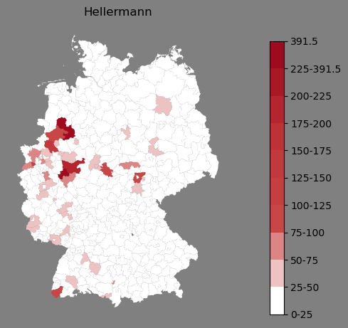 Relative Verteilung des Namens Hellermann (1996)Direkt zur Karte Die Farbskala zeigt die Anzahl von "Hellermann" bezogen auf je 1 Million Einträge. |